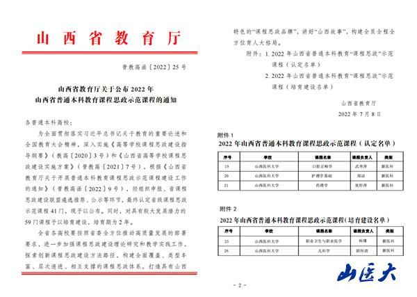 近日,山西省教育厅公布了2022 年山西省普通本科教育课程思政示范课程立项名单,我校口腔正畸学、护理学基础、药理学3门课程立项为课程思政示范课程认定课程,职业卫生与职业医学、儿科学2门课程立项为课程思政示范课程培育建设课程。