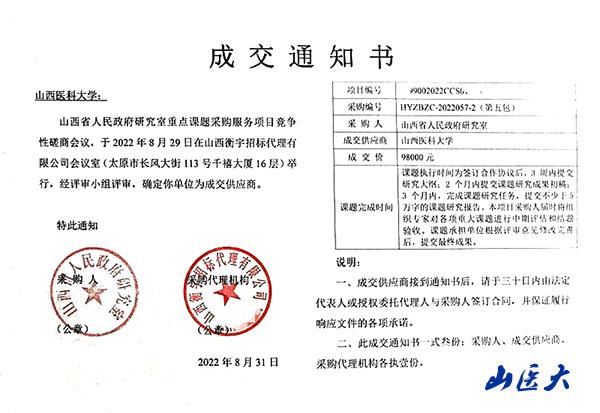 近日,山西省人民政府研究室重点课题采购服务项目结果公布,我校研究团队顺利中标《山西县乡村医疗养老问题研究》项目。该研究团队是由我校管理学院牵头组织,联合了发展规划处、公共卫生学院、人文学院等部门研究力量。这是我校首次以应标方式获得山西省政府重点课题竞争性采购服务项目。