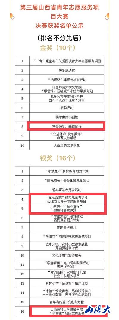 近日,第三届山西省青年志愿服务项目大赛获奖项目进行了公示。该项赛事是由团省委、省文明办、省民政厅、省生态环境厅、省水利厅、省文旅厅、省体育局、省乡村振兴局、省卫健委、省残联联合主办。我校获得金奖1项、银奖3项,在所有参赛单位中,成绩名列前茅。全省共推荐了26个项目参加中国青年志愿服务项目大赛全国赛,我校有4个项目入选。