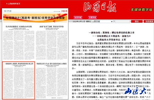 10月11日,《山西日报》“学思”版刊发校党委书记王军的理论宣传文章《一部政治性、思想性、理论性俱佳的扛鼎之作——评电视理论片<再赶考·新担当>》。