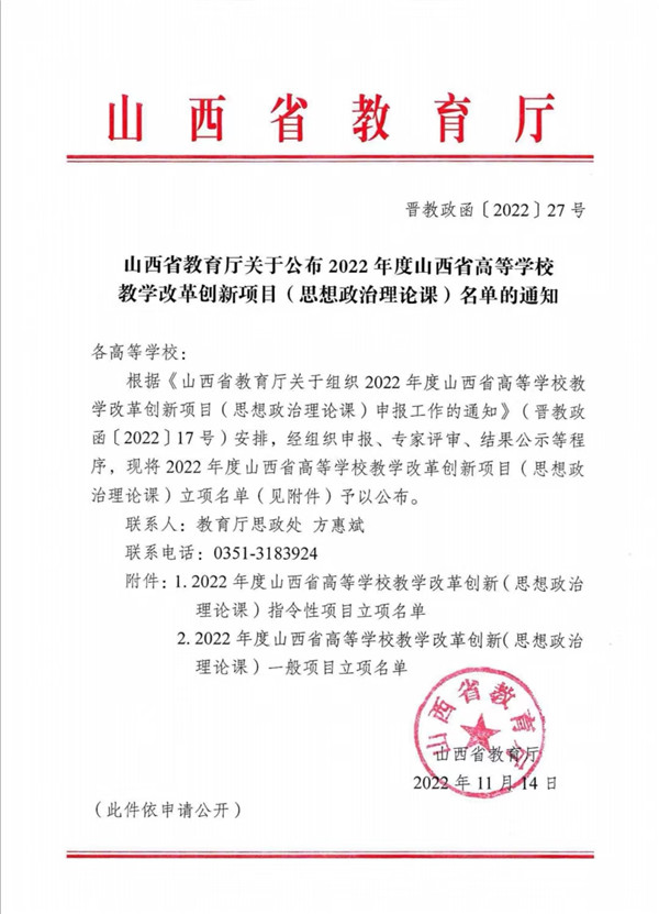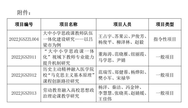 近日,山西省教育厅印发了《关于公布2022年度山西省高等学校教学改革创新项目(思想政治理论课)名单的通知》(晋教政函[2022]27号),我校申报的4项思想政治理论课教学改革创新项目全部获批立项。其中,《大中小学思政课教师队伍一体化建设研究——以吕梁市为例》获批指令性项目,《“大中小学思政课一体化”视域下教师专业能力提升机制研究》《历史主动精神融入医学院校“马克思主义基本原理”课程创新路径研究》以及《劳动教育融入高校思想政治理论课教学研究》3个项目获批一般项目。