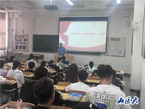 为深入学习习近平新时代中国特色社会主义思想,全面贯彻党的二十大精神,6月21日下午,校党委常委、副校长赵文军在迎泽校区B座102教室给公共卫生学院师生讲授主题教育专题党课,学院领导班子成员、党委委员、各党支部书记、支部委员、学生党员代表、入党积极分子和组织员聆听了党课,党课由公共卫生学院党委书记张志红主持。