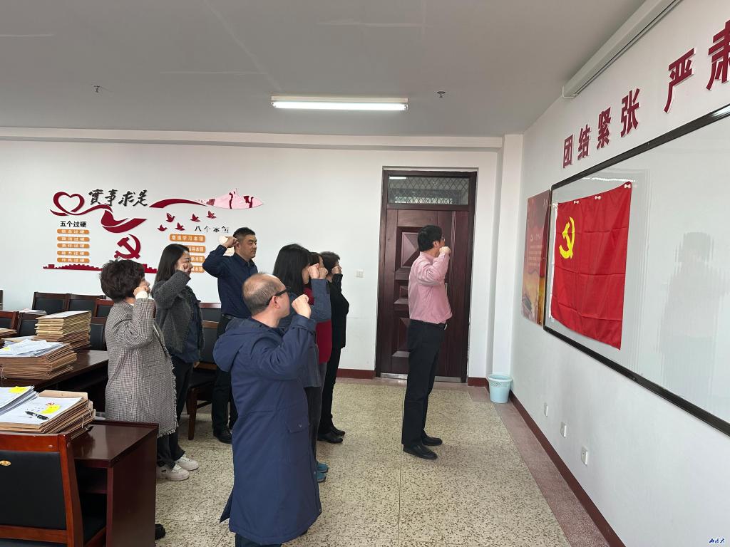 在陈显久的带领下,全体党员佩戴党员党徽,面对鲜红的党旗,高举右手,重温入党誓词。铮铮誓言,表明了一个共产党员积极接受党性熏陶,矢志不渝地坚持党的理想信念的人生选择。