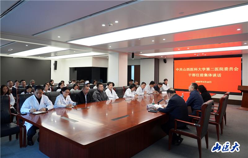 4月10日下午,我校第二医院召开新任职干部任前集体谈话会,第二医院党委书记成晓龙、党委副书记魏永红志、纪委书记王瑛出席会议。