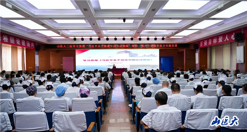 7月31日,我校第二医院举办学习贯彻《习近平关于健康中国论述摘编》精神、提升干部履职能力专题党课,特邀省政府决策咨询专家作专题辅导讲座,全体院领导,各党支部书记、科主任和护士长参加党课。
