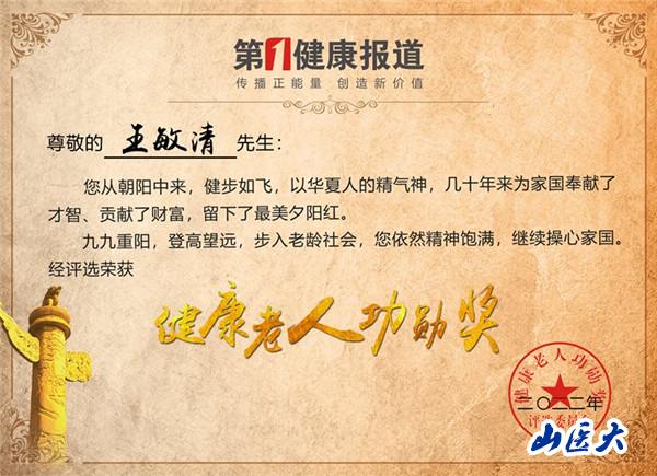 为推动全国老龄事业高质量发展,按照国家卫生健康委关于稳步推进“构建老年友好型社会”和全国老龄委关于“树立典型、弘扬先进,开展评选表彰工作“之精神,弘扬表彰宣传一批离退休后仍然在社会上担当时代使命,继续为国家发挥余热的老年健康先锋,由第一健康报道发起组织的首届“健康老人功勋”荣誉称号评选暨传播活动在全国开展。经综合评定,我校校友王敏清喜获首届“健康老人功勋奖”。