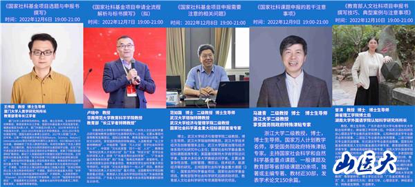 为进一步增强我校科研人员撰写国家科学基金的能力,提高标书撰写质量和中标率,切实做好2023年国家基金项目申报工作,学校科学技术部于12月1日至10日,组织各院系和附属医院科研人员参加了线上“国家基金项目申请全流程解析与标书撰写技巧专题系列培训讲座”,每天进行一场专题讲座。其中,1日-5日为国家自然科学基金项目申报系列讲座,6日-10日为国家社会科学基金和教育部人文社科项目申报系列讲座。