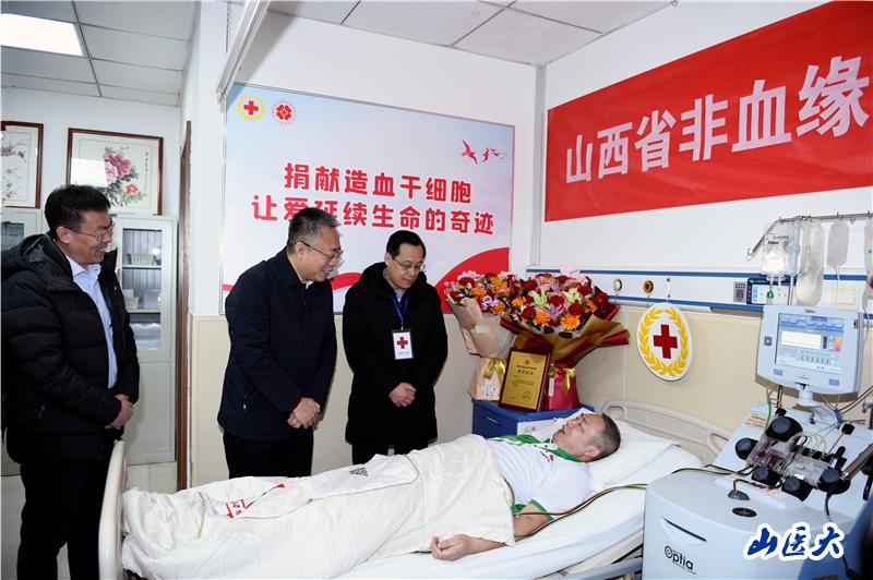 2月5日上午,山西省第300例非亲缘造血干细胞捐献采集工作在我校第二医院血液内科顺利完成。山西省红十字会党组书记、常务副会长尚日红,太原市红十字会党组书记、常务副会长张刚及捐献者所在单位领导一行来院对捐献者进行慰问,我校第二医院党委书记成晓龙及相关职能部门负责人一同慰问。