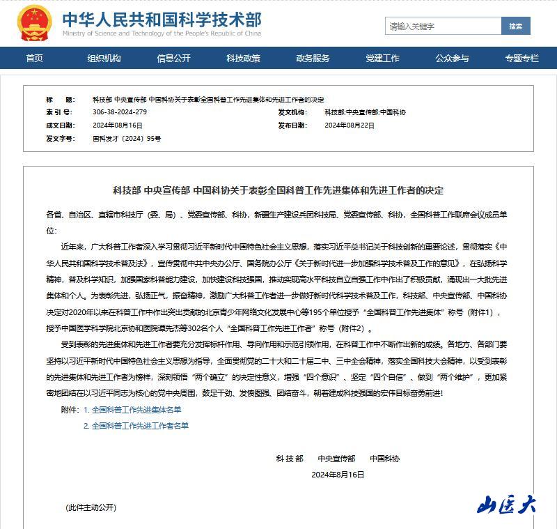 8月22日,科技部、中央宣传部、中国科协发布了《关于表彰全国科普工作先进集体和先进工作者的决定》,决定对2020年以来在科普工作中作出突出贡献的195个单位授予“全国科普工作先进集体”称号,302名个人授予“全国科普工作先进工作者”称号。我校程景民教授入选“全国科普工作先进工作者”。