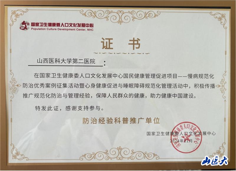 我校第二医院荣获“心身健康促进与睡眠障碍规范化管理活动防治经验科普推广单位”称号
