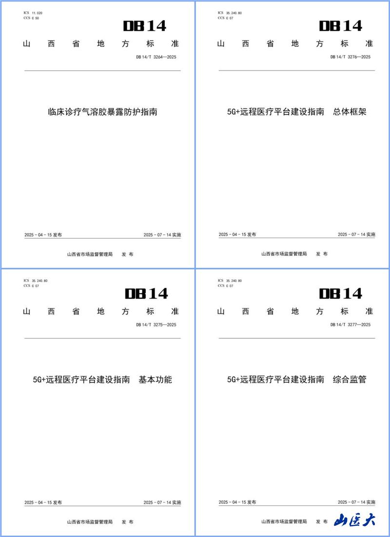 近日,由我校第二医院柴国丽团队、侯冉团队牵头,联合多家医疗机构共同编制的四项山西省地方标准正式发布,将于2025年7月14日起实施。这四项标准涵盖临床诊疗防护和远程医疗建设两大领域,标志着山西省医疗健康标准化建设取得重要突破。