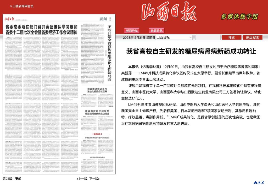 山西日报 | 我省高校自主研发的糖尿病肾病新药成功转让